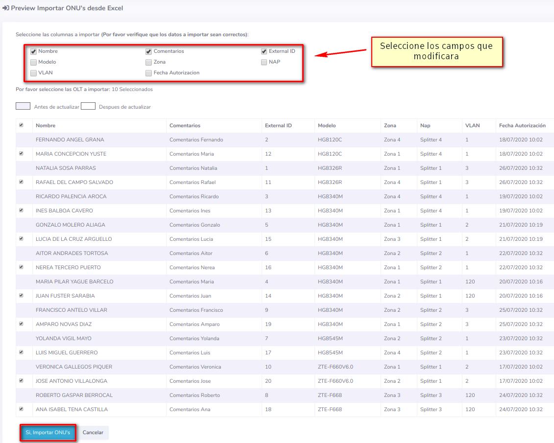 2Con el archivo descargado con nombre "ONUs Autorizadas - Mi empresa.csv", editaremos la información de nuestro interés. Recuerde que solo los campos mencionados al inicio de esta documentación se podrán modificar.