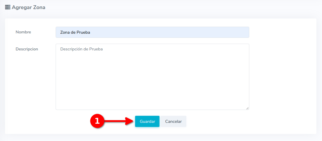 3Ahora se nos mostrara un formulario donde le asignaremos un nombre y una descripción a la zona. Una vez hecho esto debemos seleccionar la opción guardar. Esto agregara la Zona al sistema y podremos usarla.