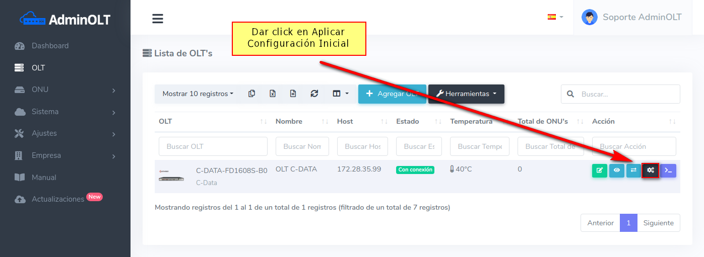 Al aplicar esta acción AdminOLT creará las comunidades que registró al momento de agregar la OLT en el sistema, de igual manera se creará un LineProfile que se usará al momento de autorizar una ONT esto implica la creación de una DBA y por último se crearán unos Traffic Tables.