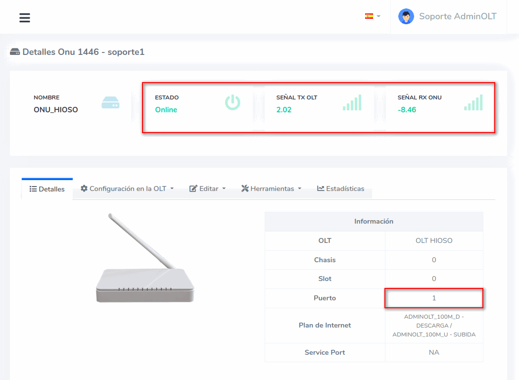 4Cambiar puerto físicamente y verificar el estado de la ONU