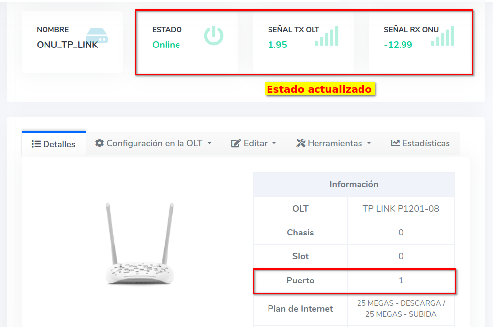 4Cambiar puerto físicamente y verificar el estado de la ONU