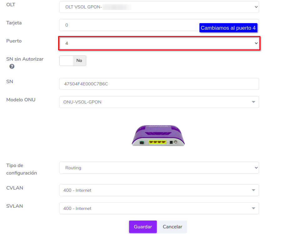 En este ejemplo la ONU se encuentra en Slot 0 en el Puerto 1; lo pasaremos al Puerto 4. Antes de editar verifique que la ONU cuente con servicio