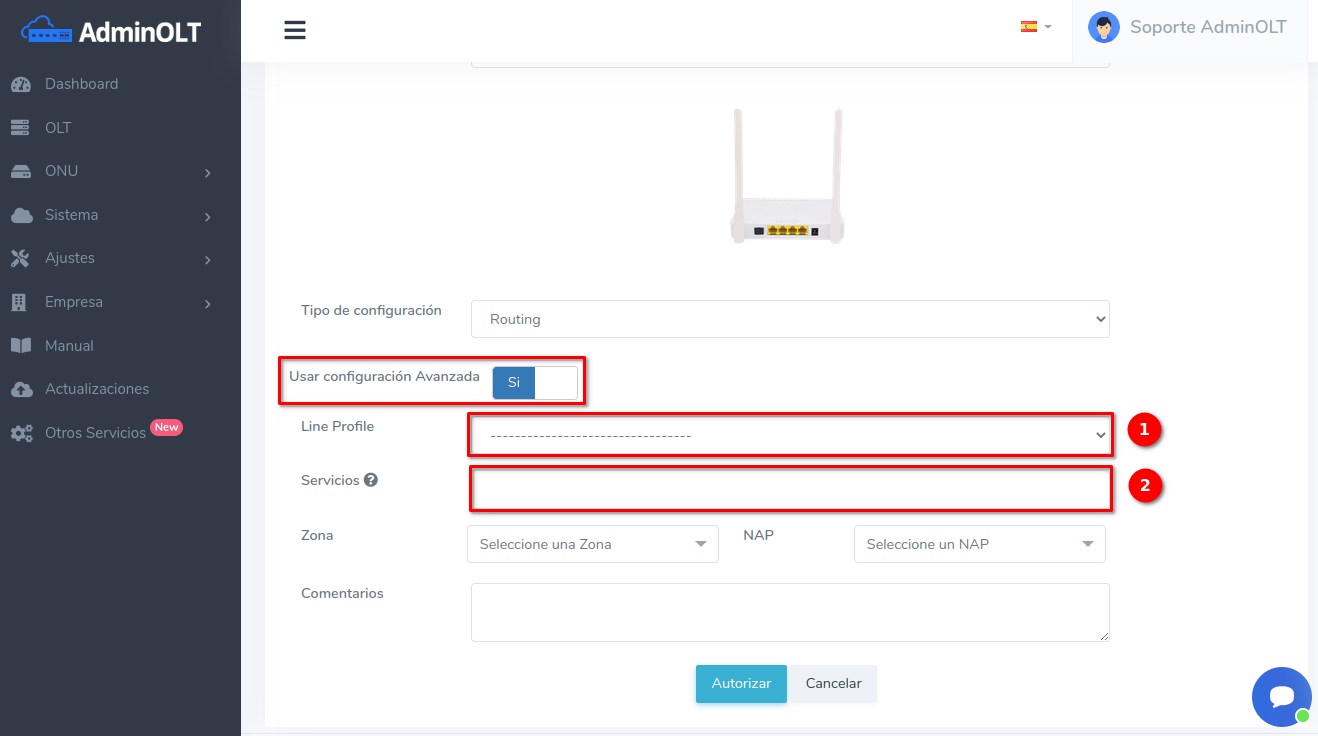 Al autorizar la ONU habilite "Configuración Avanzada" y seleccione el Line Profile creado en el paso anterior; para después modificar tanto la CVLAN y Planes de Velocidad.