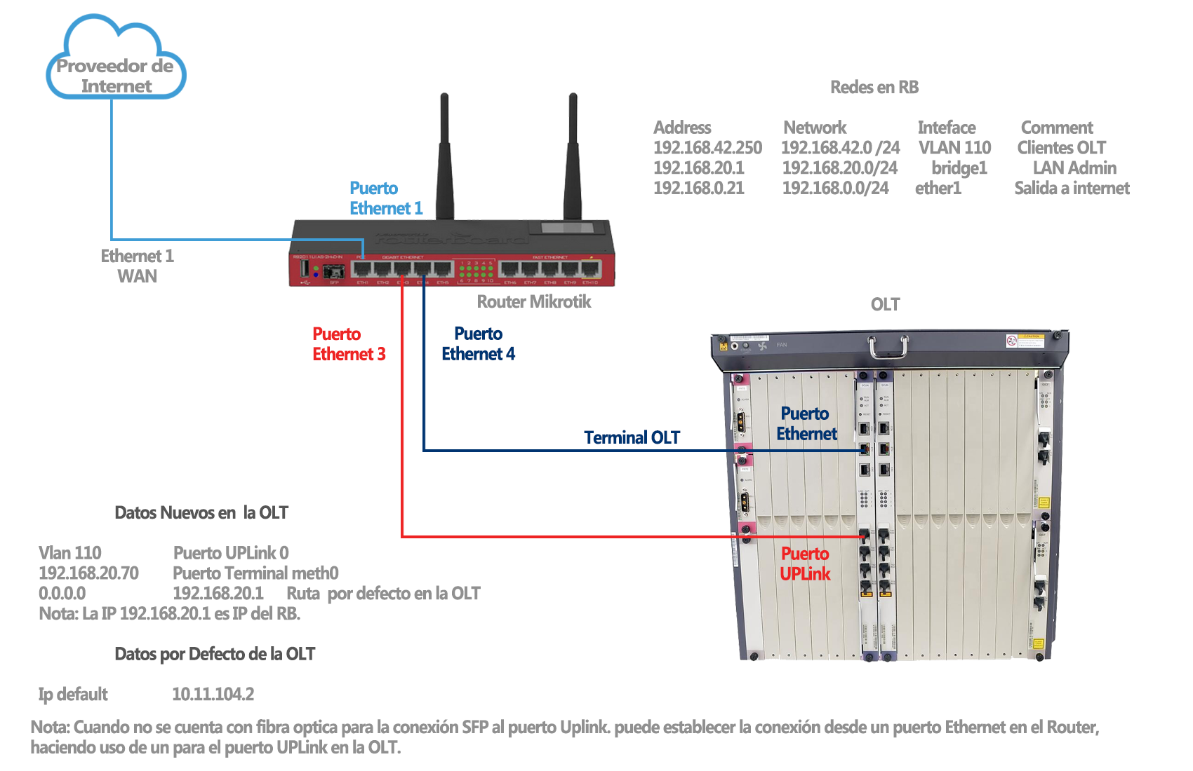 1.1Direccionamiento para la red default de Administración. Esta es la red que viene en las OLT ZTE nuevas o que se restablecieron a los valores por defecto. Esta IP solamente nos servirá para conectarnos por primera vez al equipo, ya que posteriormente en la configuración de la OLT vamos a cambiar la por nuestra red de administración.