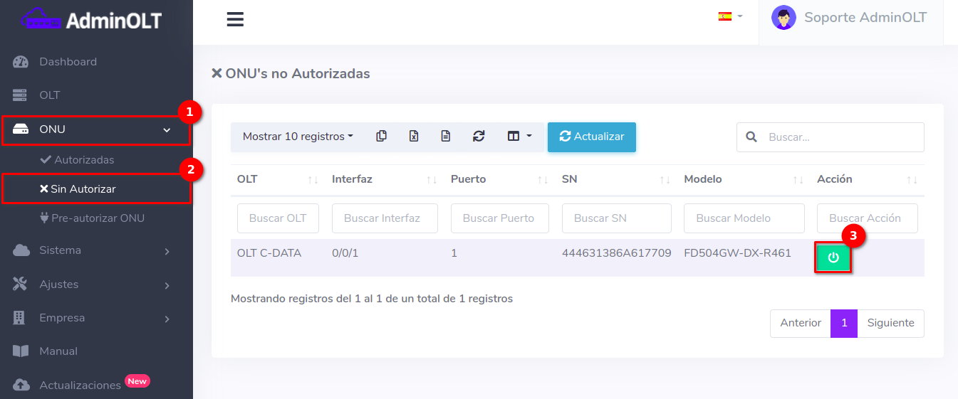 Al hacer esto, la configuración se borrará de la ONU y del sistema AdminOLT.