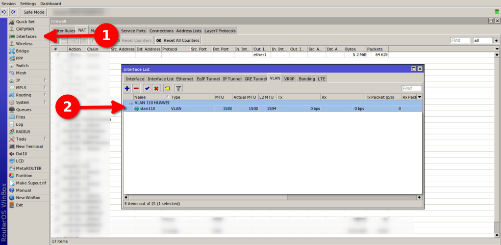1Para esto debemos dirigirnos en mikrotik a la seccion de Interfaces/VLAN y agregar una VLAN con el puerto 110.