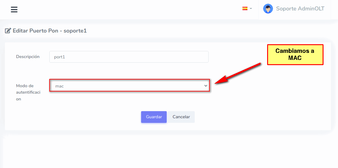 3 Modificamos el Modo de Autentificación del puerto PON