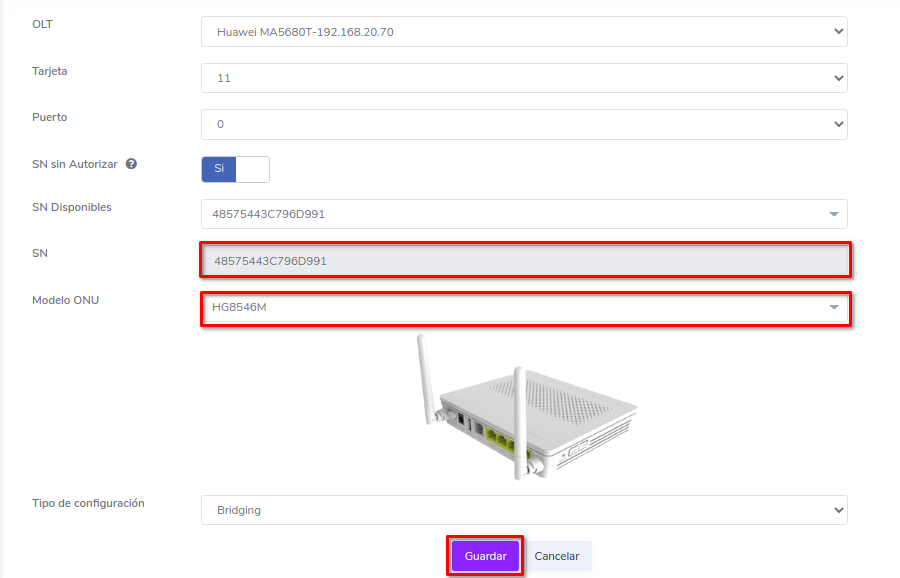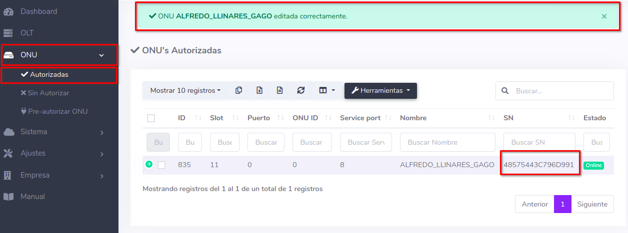 En AdminOLT podemos editar información de una ONU Autorizada en la OLT, supongamos que alguna de las ONUs que tenemos autorizadas en el sistema se estropea. Tomaremos como ejemplo esta situacion para explicar el propósito de esta función. Asi que en ese caso en AdminOLT al editar ONU por SN podemos tomar información de alguna ONU no Autorizada y usarla, sin perder la configuración inicial que teníamos.