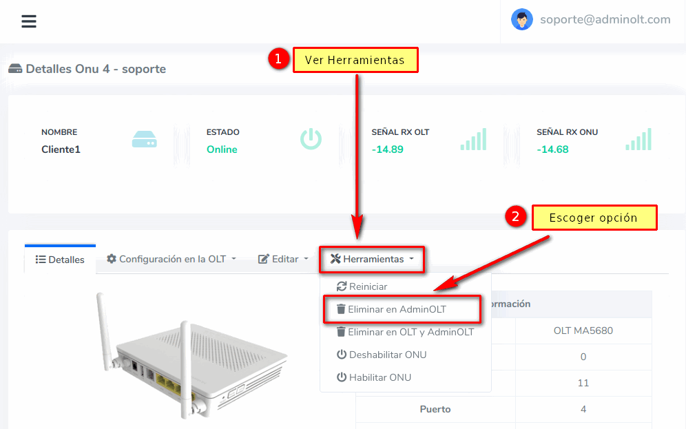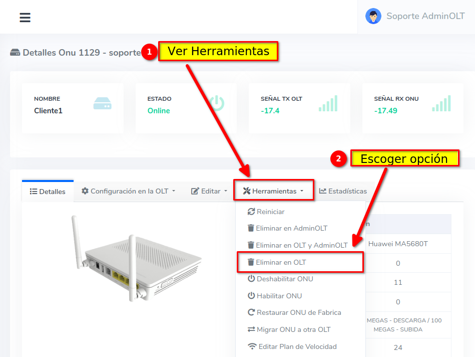 3 Vamos a Herramientas y escogemos Eliminar en OLT y AdminOLT