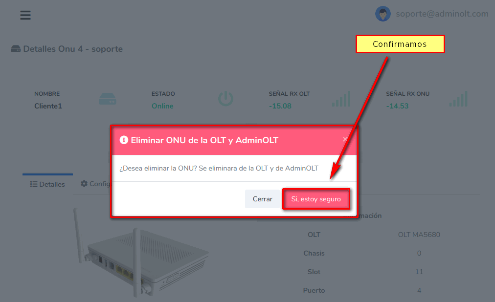 3 Confirmamos la acción de eliminar la ONU de la OLT