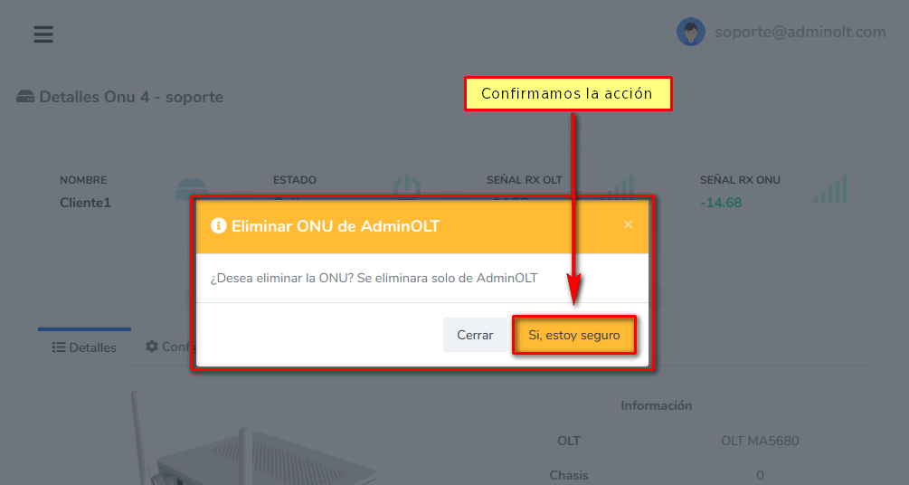 4 Confirmamos la acción de eliminar la ONU de AdminOLT y de la OLT