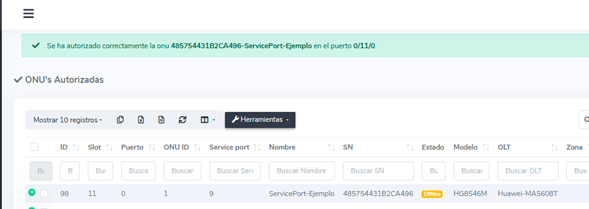 2.- Sincronizar la información de la onu en AdminOLT con la información de la OLT: Esta acción va a actualizar el service port a partir de la información que se halle en la interfaz que se obtenga