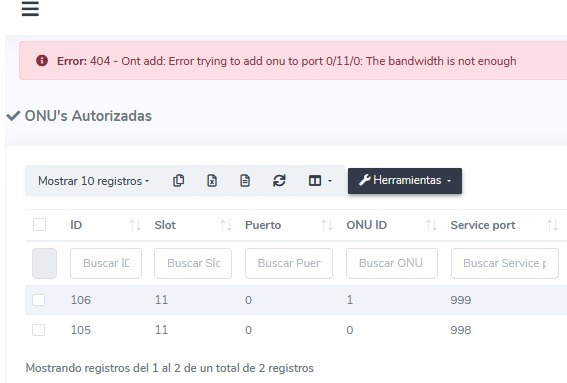Para poder seguir autorizando ONUs es necesario habilitar un nuevo puerto PON o eliminar las ONUs que no se esten utilizando en el puerto que ya no tiene disponible ancho de banda.