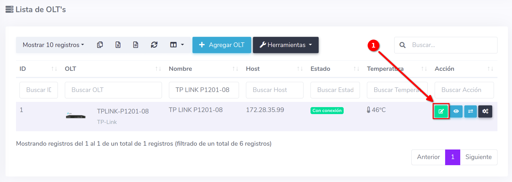 1 Para poder establecer la conexión de manera exitosa es necesario que generemos un script, para poder generarlo, nos dirigimos a nuestra OLT y seleccionamos la opción de editar.