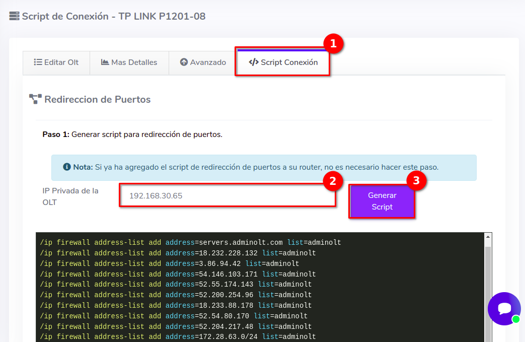 2Aquí ingresaremos nuestra ip privada y seleccionamos la opción Generar Script. A continuación veremos que se nos proporciona un Script.